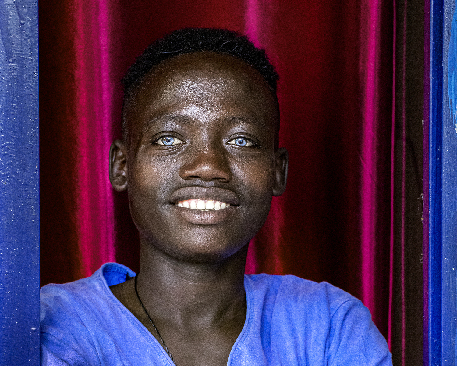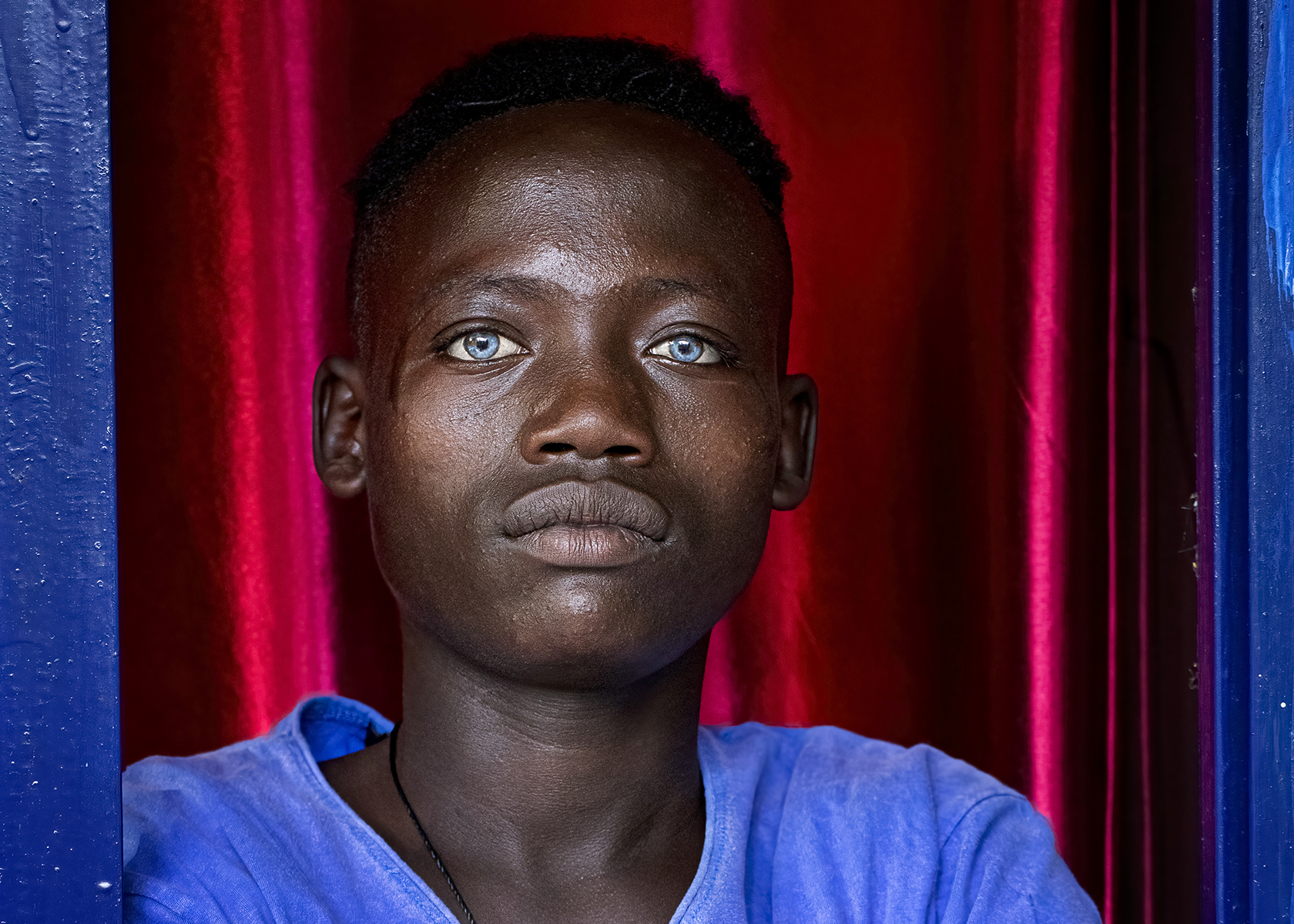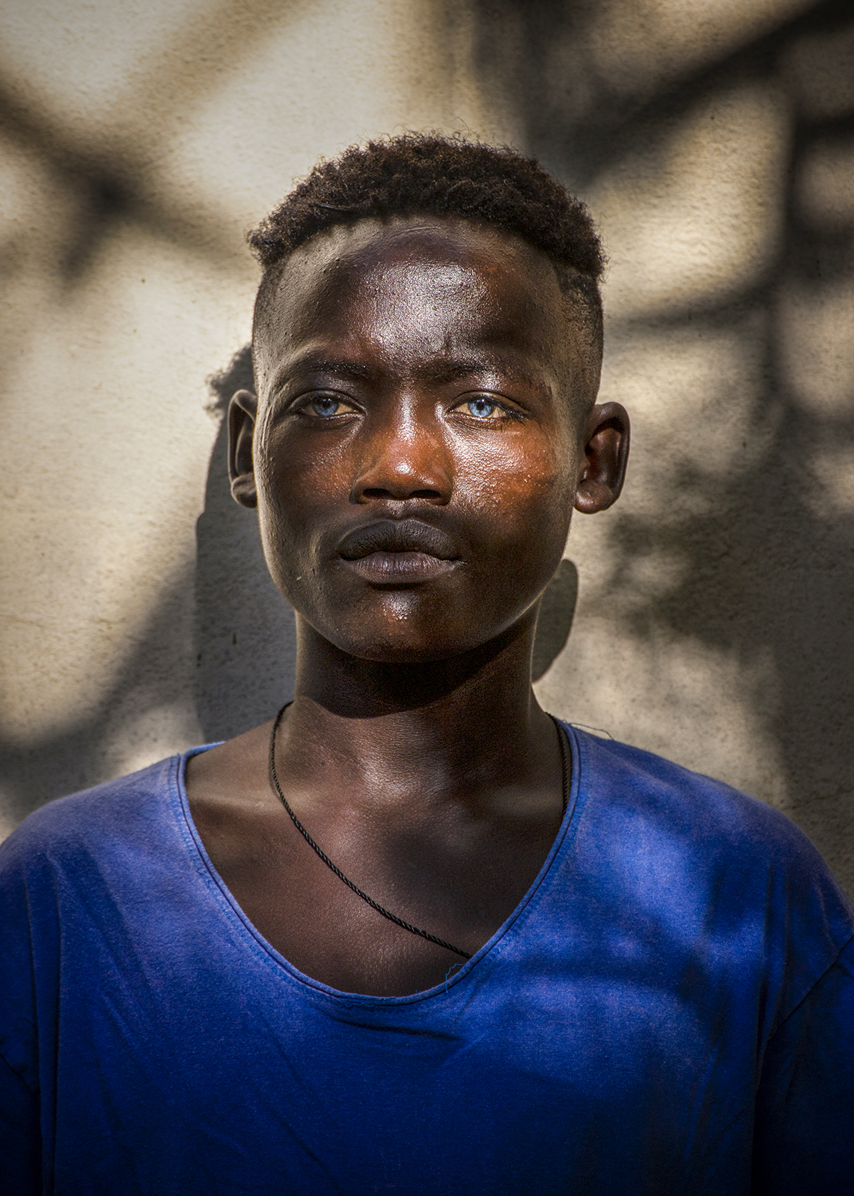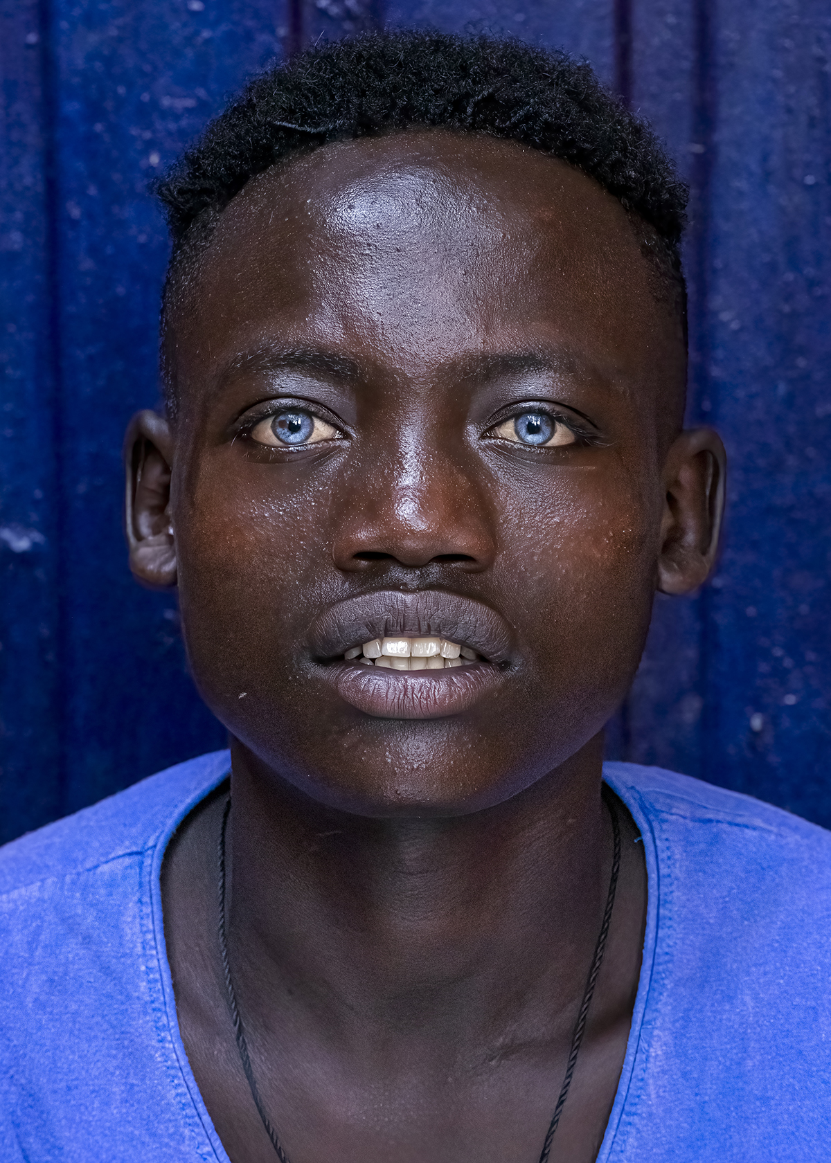 He was born with these blue eyes, inherited from his mother, a result of Waardenberg syndrome. As a child in Jinka, Ethiopia, he was bullied for this difference. That was before tourists discovered him on the streets many years ago and began paying to take his photo.