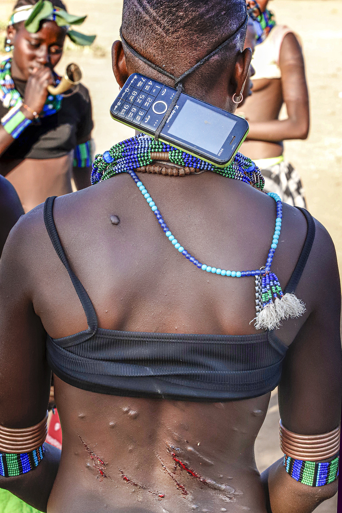 More jarringly, the young woman at the Hamar bull jumping ceremony, her whip marks bleeding on her back from a traditional ritual, while her cell phone hangs on a strap around her head.