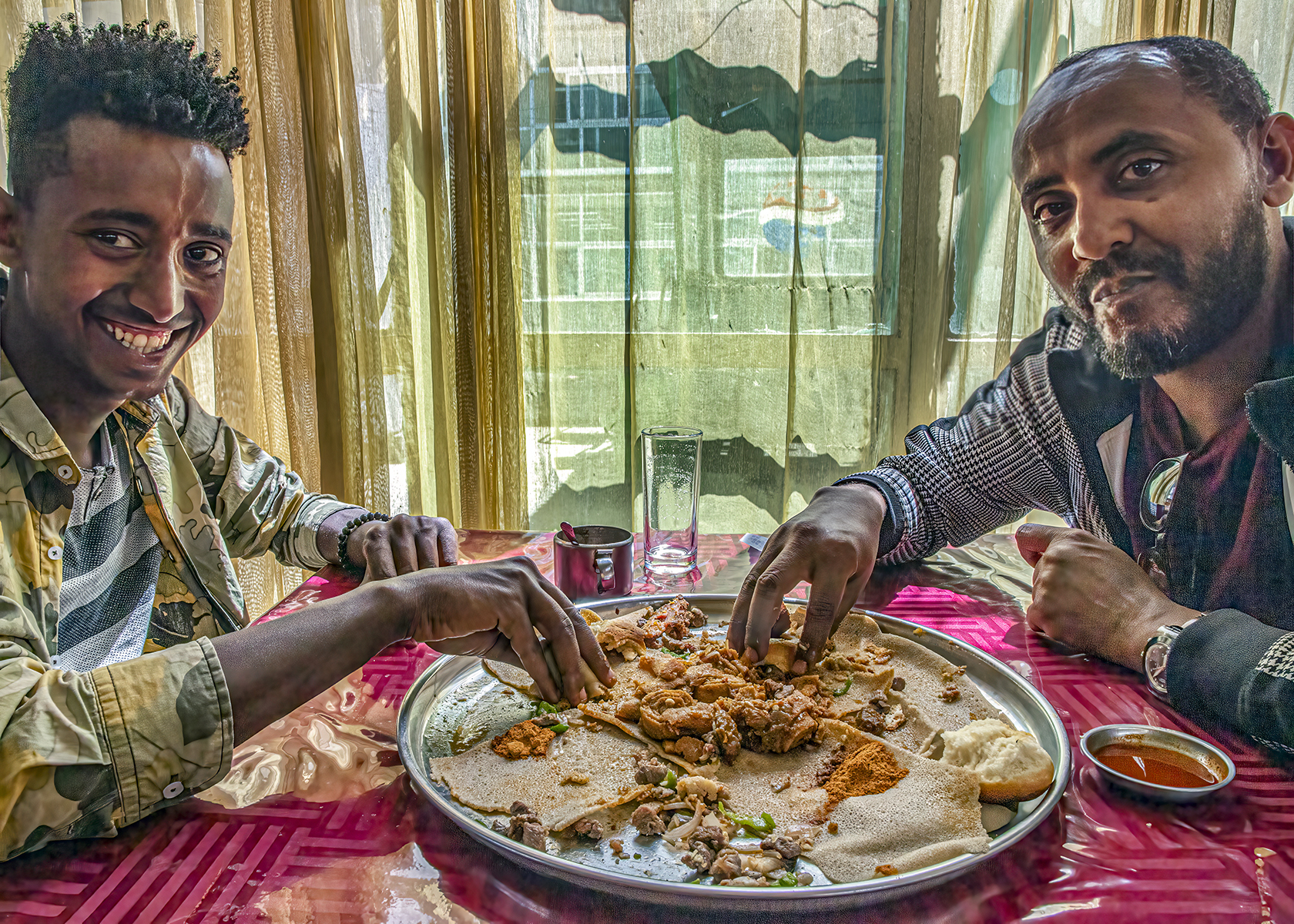 We went to a restaurant for traditional lunch, injera. Yared tore off some of the injera bread and rolled it in meat and spice. He reached towards me, and I extended my hand to take the piece. Nope. He wanted to place the food directly in my mouth. He said the practice is called gursha, and feeding someone by hand is an act of honor. It takes place three times to be complete. I went with it, grateful for his kindness.